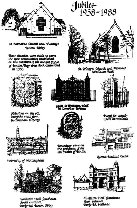 Our photograph shows the tea towel that has been produced for the golden jubilee of St. Mary's and St. Barnabas. The brainchild of Maureen Voisey, a member of St. Mary's congregation and also of Lenton Local History Society, it has been on sale since April. The tea towel has proved extremely popular and the first batch completely sold out, generating about £300 profit for the two churches. More have been ordered from the manufacturer, Lawton Arts of Huddersfield, but the choice of colour is now restricted to brown.