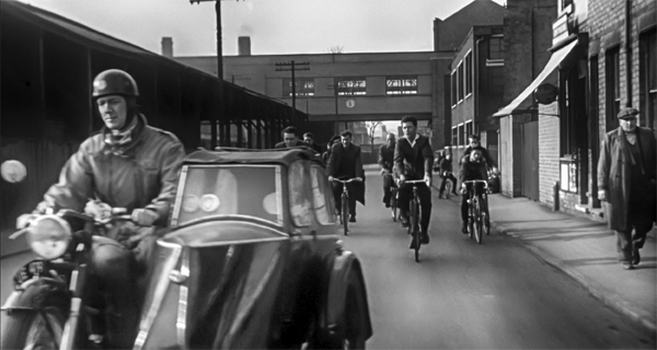 In 1957, aged fifteen, Brian Fewkes obtained a job at the Raleigh Cycle Works in Lenton working in the wheel shop. He travelled to and from his home in Bilborough on his bike. In early 1960 the factory interiors figured in the shooting schedules for the film Saturday Night and Sunday Morning based on the novel by Alan Sillitoe. The wheel shop did not feature in the film but one evening as Brian was leaving work he was prevailed upon to ride his bike along Faraday Road in the company of several other cyclists while the film cameras were rolling. This shot made it into the final cut and Brian went away £2 the richer.