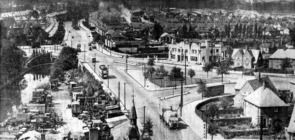 This photograph originally appeared in the Nottinghamshire Guardian dated 4th September 1948. It shows a stretch of Wollaton Road with Western Boulevard off to the right and the end of Middleton Boulevard just visible on the middle left. The photographer had gone to the top of Player's bonded warehouse in order to get this shot. He was commissioned to do so because it had just been announced that work would shortly commence on the construction of two road islands to ease the flow of traffic at this point. On the extreme left of the picture you can see the section of the Nottingham canal as it is made its way under the Wollaton Road and on past the properties that constituted Radford Woodhouse. In the early days of the canal, coal from a nearby colliery would be brought down to this point on the canal in order to be loaded on barges and transported by water to neighbouring towns. |