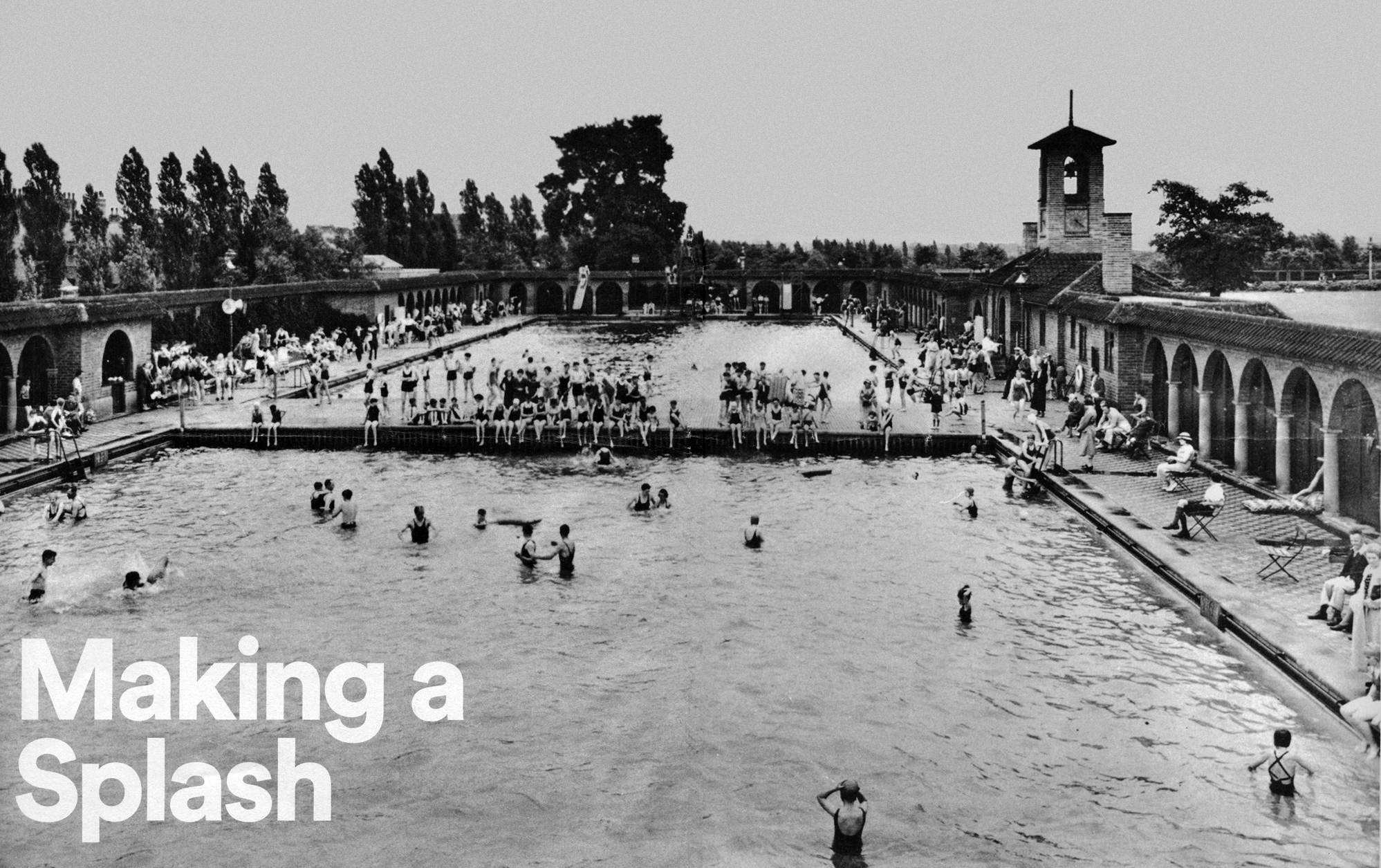 Only a small amount of space at Highfields Lido was available for those who just wanted to sunbathe. In order to increase the available sunbathing area, in 1936 a sun deck was installed across the width of the pool, which effectively created two separate pools. Given the presence of the sun deck in this photograph it must date from at least the latter half of the 1930s - if not later.