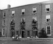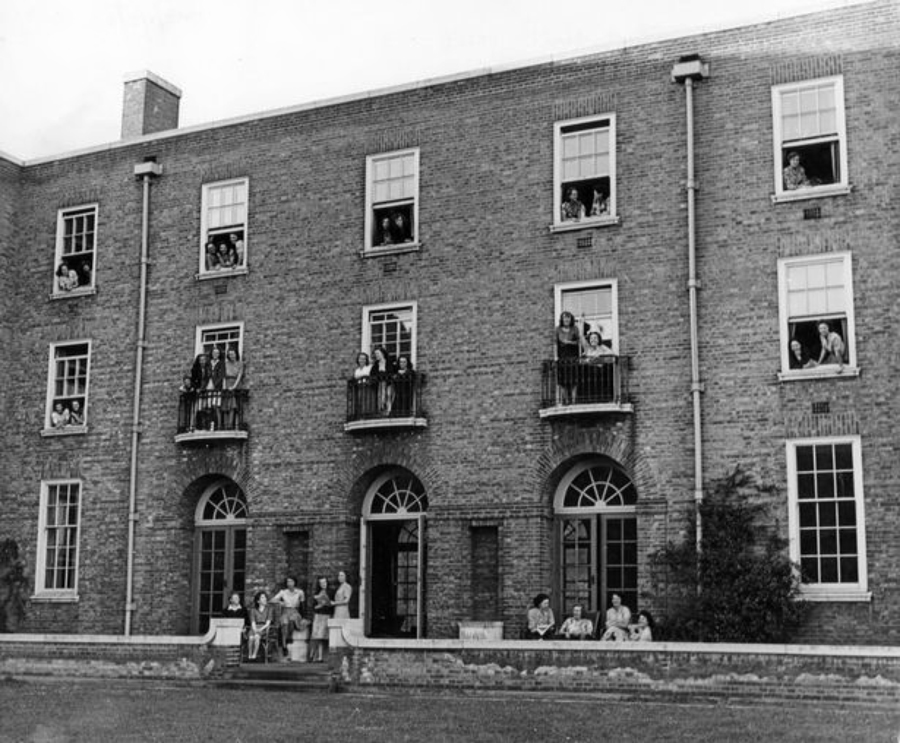 A photograph taken soon after the building was finished and first occupied by female students who can be both outside and looking out the building from the balconies and the windows. |