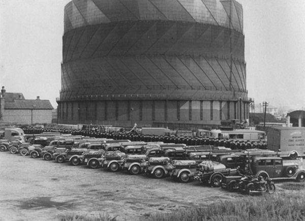 Triumph Road is just visible immediately in front of the gasometer and if you look really carefully you should be able to spot a pedestrian, a cyclist and at least two small children making their way along the road. Note that the gasometer appears to have been painted different colours to help camouflage it from the enemy.