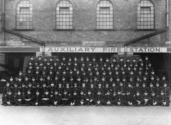 The firemen are positioned in front of the Triumph Road Fire Station with one of the appliances just visible to the left of the photograph. We now believe the photograph was probably taken in the run up to 18th August 1941, which was the official end date of the Auxiliary Fire Service. After this date these men would have been absorbed into the newly formed National Fire Service. [Our thanks to Terry Maslin for help with dating this photograph.]
