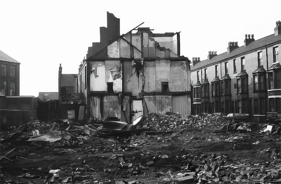 This photograph taken in 1981 shows the terrace of properties on the eastern side of Alderney Street undergoing demolition. Visible on the left-hand-side of the shot is the southern end of the Steada Raywarp factory which would also come down to make way for Barratt's Castle Gardens housing complex. |