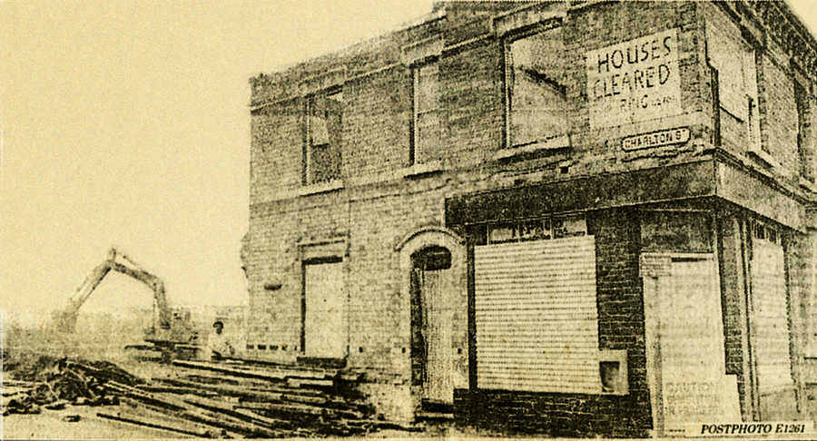 The original version of this photograph was featured in an edition of the Nottingham Evening Post dated 13 April 1981. Headlined 'Gardens, Bridge in New Plans' the accompanying caption read: Houses cleared, says the notice on the last house to be demolished in Charlton Street, Nottingham. Thirty had previously been knocked down on the site, off Castle Boulevard. Gardens will be provided for the renovated houses in the background, and a bridge is planned to Castle Marina on the south side of the canal.' The property in question housed Terry Allsopp's junk shop and the notice referred to the house clearance service he operated rather than the operations of the demolition company! |