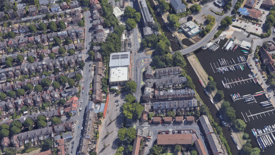 This 2024 aerial shot of much the same area as in our earlier aerial photograph shows what replaced Chartlon Street - namely the Castle Marina bridge and the landscaped area either side of the roadway. |