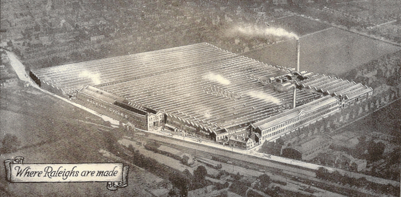 This second aerial view of the Raleigh factory with Faraday Road in the foreground has been taken from a 1928 Raleigh handbill which listed the addresses of all the official Raleigh dealerships across the country. |