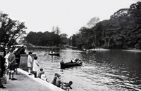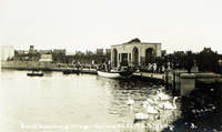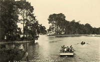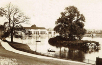 Another view of the eastern end of the lake with tea pavilion and ticket office both featured. In this particular image the motor launch is just setting out with a boat full of people. |
