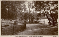 Taken at the western end of the lake but looking back towards the Trent Building. On the left just peaking through the trees is Highfield House. At the time when the photograph was taken this would have been the home of the college principal and after 1948 the vice-chancellor. The postcard was produced by District View Publishers of Leicester. |