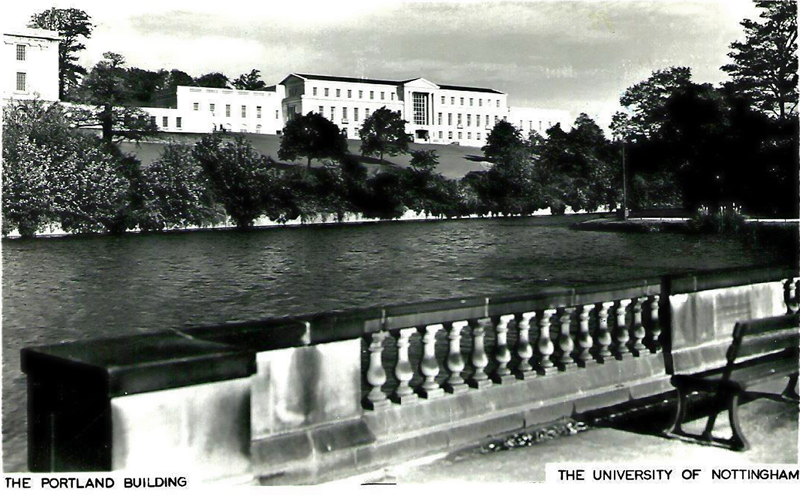 The main focus of this picture postcard is clearly the Portland Building, which houses the Students Union at Nottingham University. The very earliest this image could have been taken is 1956 when the building first opened. |