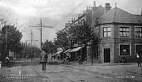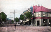 This hand-tinted picture postcard shows the same junction in the early 1900s when the tram poles were still positioned in the centre of the road. |