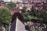 A 1980s view of Lenton Boulevard taken from the tower of Holy Trinity Church. The vicarage garden now houses the new vicarage and the petrol station has since made way for the new shops. The terrace of properties on Lenton Boulevard shown in the previous shot can be seen in the middle distance. |