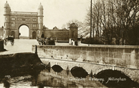 Taken as horse-drawn carts were passing along Derby Road this sepia image provides us with fine detail of the bridge which allows the River Leen to pass under the road. |