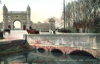 This double-size picture postcard allows us an expanded view of this portion of Derby Road. On the right is the stone parapet of the canal bridge and beyond is the No.4 lock. The boundary wall of the park stretching off along Derby Road can be seen to the left of Lenton Lodge. The matching stone parapet of the other side of bridge is on the left along with a view of the canal itself. This road bridge required to be widened once Lord Middleton resolved to re-route the Derby Road and explains why the road itself is so wide at this particular point. |