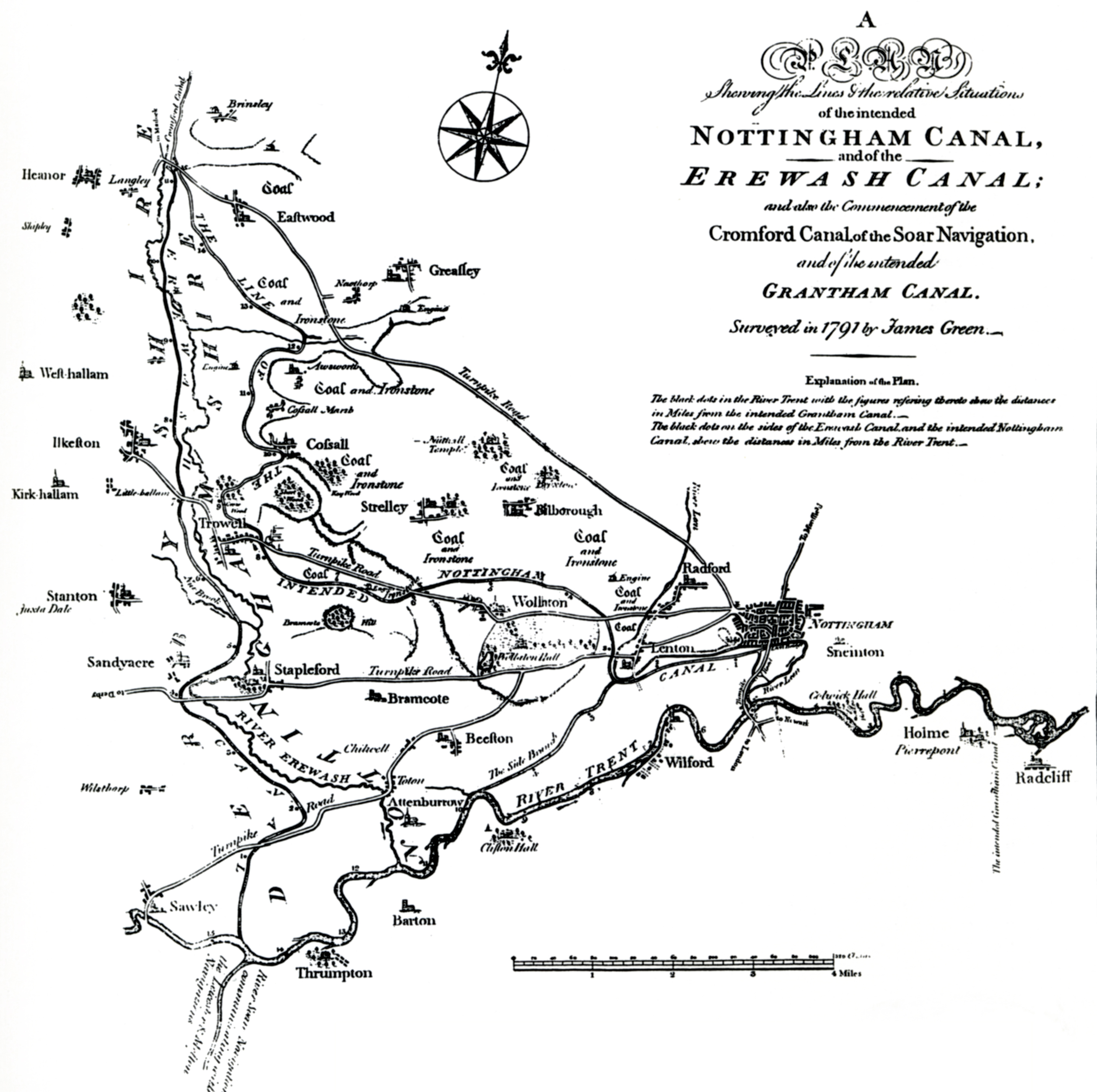 A canal from Cromford along the Derwent Valley to connect up with the Erewash canal at Langley Mill was given parliamentary approval in 1789. This meant further markets for Erewash Valley coal were opening up. Increasingly Erewash Canal - A copy of an original map deposited at the Local Studies Library, Nottingham. Click to enlarge this map. Nottingham collieries looked as though they were going to be at a disadvantage and it seemed that the Erewash pits would flourish at their expense. Eager to ensure the town didn't miss out, a number of Nottingham men called a public meeting in October 1790 to discuss the possibility of constructing a rival to the Erewash which would run from the Cromford canal to Nottingham and on into the Trent. Those at the meeting apparently thought the proposal highly beneficial and elected a committee of nine to pursue the matter. William Jessop was asked to act as engineer and select the best route between Nottingham and Langley Mill. He was also requested to survey the land across Beeston Meadows for a branch canal to the Trent from Lenton. Lord Middleton evidently had his own ideas on the way that the canal should go. It is not clear what these were but we do know that Jessop considered they would be impractical on account of the need for deep cutting and tunnelling. His own proposed line, however, didn't meet with Lord Middleton's approval. Jessop had suggested that the canal go round the western side of Wollaton Park. Lord Middleton said he would oppose the whole venture unless the canal was made to run along the eastern boundary, even though this would mean an additional expense of about £2,500. The line of the canal was moved accordingly.