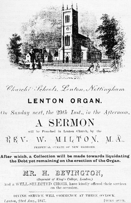 In October 1902 Mrs. Mary Ann Sharp died and when her will was read it was revealed that she wished a memorial window, not exceeding £150 in value, be erected at Lenton Parish Church to the memory of her parents William Rastall and Ann Brewill. W.R. Brewill had been a butcher in Nottingham after starting in business in a shop in New Lenton. He lived to the age of 93 and only died five years before his daughter Mary Ann in 1897. One of his sons was A.W. Brewill who later designed the Albert Ball Memorial Homes. Evidently the manufacture of a memorial window of four lights for less than £150 was no problem and the Brewill window (W7) can be seen in the south aisle of the church.