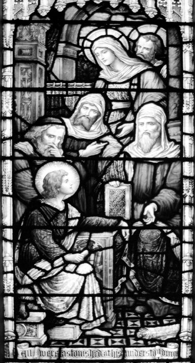 His premises on Stoney Street had a chapel in the basement which employees could use and the vicar of Lenton used to officiate at the early morning service. Thomas Adams was buried in the Rock Cemetery on Mansfield Road after a funeral which some 10,000 people are said to have attended. His memorial window (W6) erected by 'friends and neighbours' is on the south aisle and depicts scenes taken from four of Jesus's parables. Included in these are the return of the prodigal son and the good Samaritan. After the Adams window had been paid for, some money still remained and so a small window in the south east of the south aisle (W8) was also commissioned. Known as the 'Timothy Window', it contains a portrayal of a young boy being instructed in the scriptures by his mother.