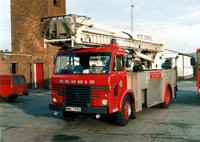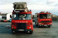 A 1986 photograph showing a Dennis Simon Snorkel, with its hydraulic platform, parked in the yard at the back of the Dunkirk Fire Station. |