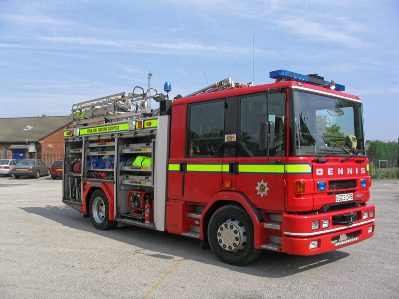 In this photograph, almost certainly taken at the same time as the previous photograph, the Dennis Simon Snorkel is parked up alongside another Dennis fire vehicle, which were both produced by Dennis Specialist Vehicles of Guildford, Surrey. |